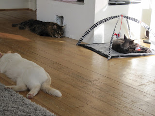Och till sist 3 katter som nästan har värmeslag. Mannen är i Frankrike och jag passade på och elda lite för mycket så vi hade 34 grader inne i går på dagen...